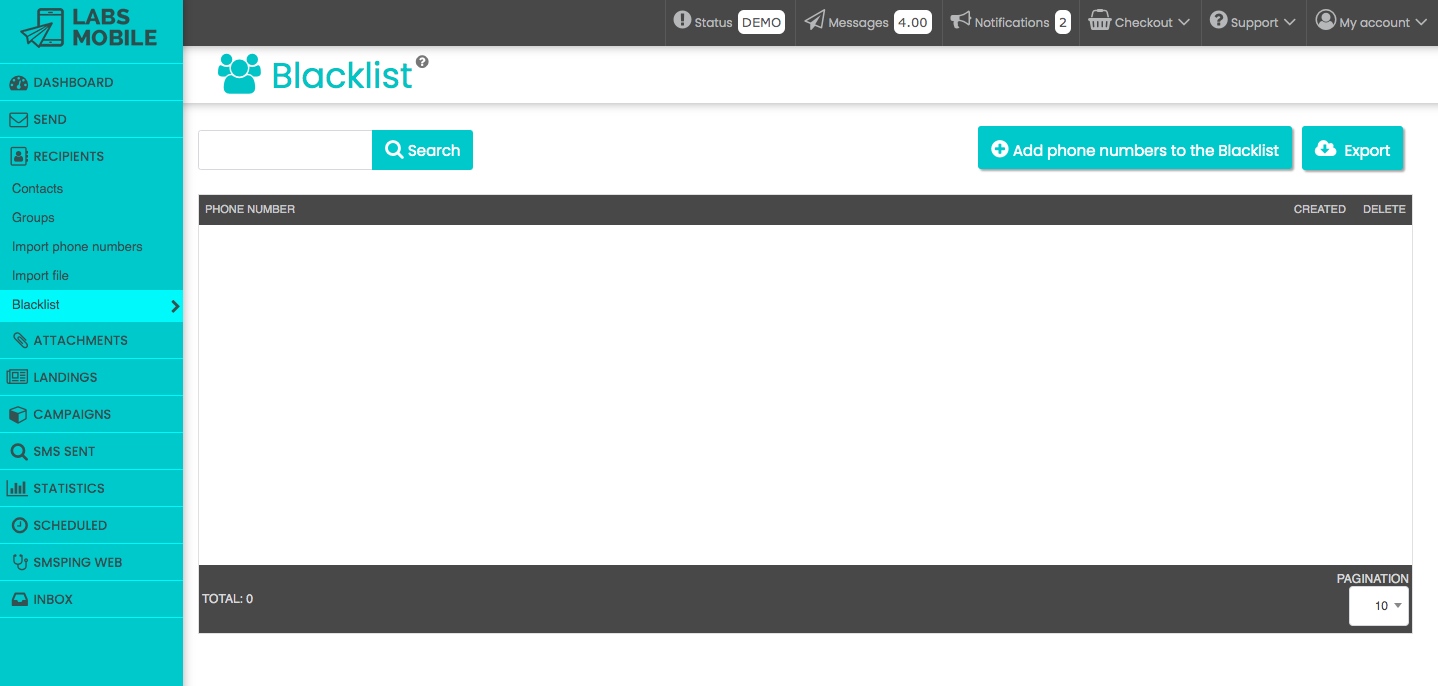 It’s not necessary to enter any specific menu, as the sending section inside the platform has this tool. Each one of the unsubscribed numbers is now part of the blacklist. This is a tool that each client of LabsMobile has in their control panel. When entering this section, they can observe and modify all the phone numbers that are unsubscribed.