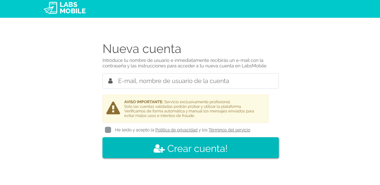 2- Crear una cuenta en la plataforma LabsMobile con un email de registro.